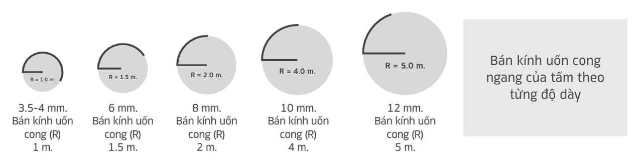 Hình ảnh: Bán kính uốn cong ngang của tấm Cemboard SHERA Thái Lan theo từng độ dày
